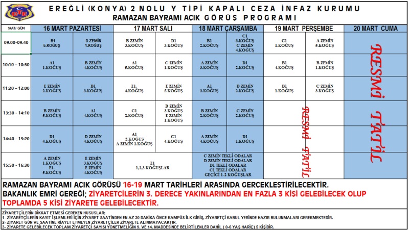 2026 RAMAZAN BAYRAMI AÇIK GÖRÜŞÜ PROGRAMI AŞAĞIDA BELİRTİLEN TABLODAKİ GİBİ OLACAKTIR. TÜM ZİYARETÇİLERE DUYRULUR.