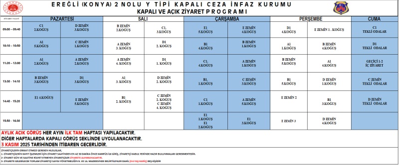 Hükümlü ve tutukluların ziyaret programı 3 Kasım 2025 tarihinden itibaren aşağıda gösterilen tablodaki gibi olacaktır. Hükümlü ve Tutuklu ziyaretçilerine duyrulur.