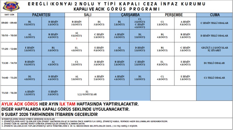 Hükümlü ve tutukluların ziyaret programı 9 Şubat 2026 tarihinden itibaren aşağıda gösterilen tablodaki gibi olacaktır. Hükümlü ve Tutuklu ziyaretçilerine duyrulur.